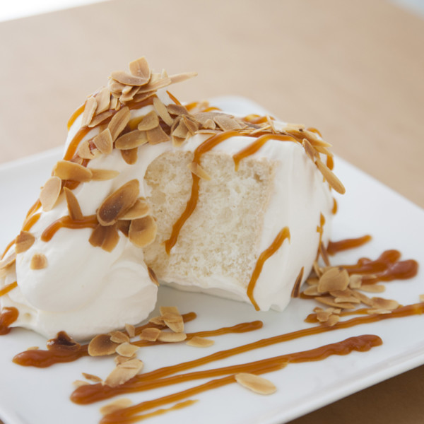 シフォンケーキの生地に米粉を使ったことによりフワフワでありながらもっちりとした食感を出しています。たっぷりかかった生クリームと生キャラメルが食欲をそそります。アーモンドの食感がシフォンケーキのフワフワもっちりとの絶妙なバランスが最高!